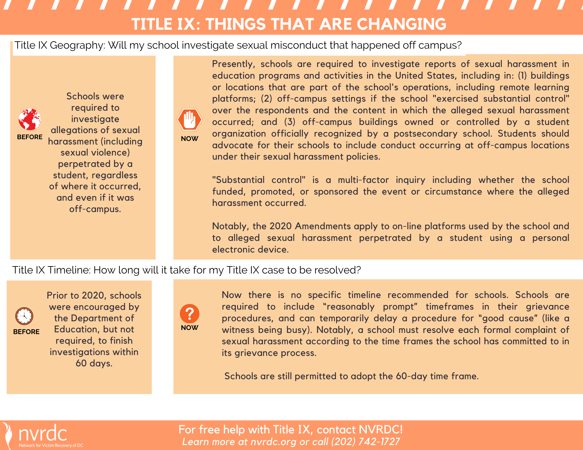 NVRDC created various resources to help student-survivors understand Title IX, the Clery Act, and related topics. We also creates a series of resources specifically focused on breaking down the US Department of Education’s 2020 Title IX changes.