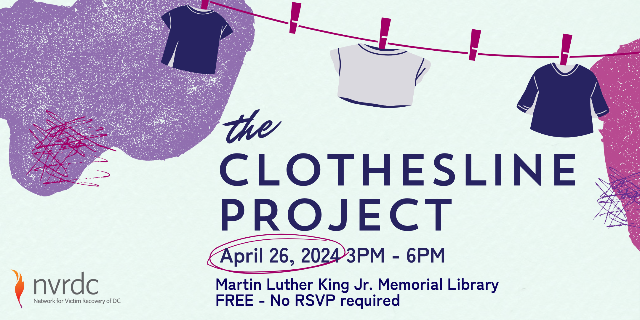 As part of National Crime Victims' Rights Week (NCVRW), Network for Victim Recovery of DC will be hosting the Clothesline Project on Friday, April 26 from 3pm-6pm at the Martin Luther King Jr. Memorial Library in their 5th Floor Event Space.
